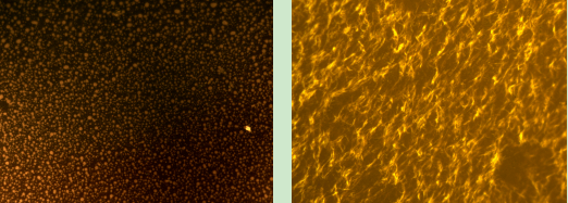 通過(guò)熒光顯微鏡,研究人員可以分析瀝青改性機(jī)理,了解改性劑如何影響瀝青的性能,從而優(yōu)化改性瀝青的制備工藝。如聚氨酯改性瀝青通過(guò)熒光顯微鏡觀察不同養(yǎng)護(hù)時(shí)間時(shí)聚氨酯改性劑在瀝青中的分布形態(tài)。隨著養(yǎng)護(hù)時(shí)間的延長(zhǎng),體系中的聚氨酯改性劑逐漸交聯(lián)固化形成三維網(wǎng)絡(luò)狀結(jié)構(gòu),這使得改性瀝青及其改性瀝青混合料性能增強(qiáng),提升了道路的高溫穩(wěn)定性和耐久性