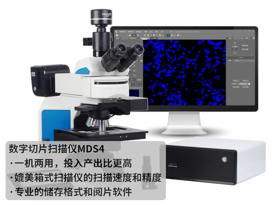 明美數字切片掃描儀MDS4是更符合大部分單位需要的數字切片掃描儀器。MDS4既是研究級熒光顯微鏡,又是數字病理切片掃描儀,一機兩用,有媲美箱式掃描儀的掃描速度和精度,也有專業的儲存格式和閱片軟件,投入產出比更高。