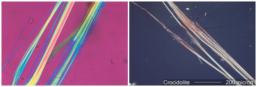 角閃石類礦物石棉(左鐵石棉Amosite,右青石棉Crocidolite)