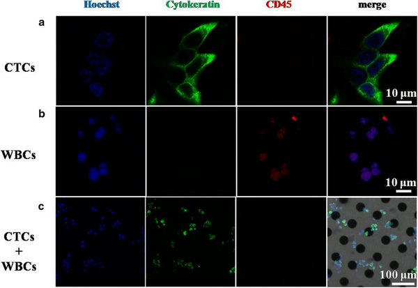 有DAPI熒光(藍(lán))和CK熒光(綠),無(wú)CD45熒光且細(xì)胞核尺寸較大,判定為CTC;有DAPI熒光(藍(lán))和CD45熒光(紅),判定為白細(xì)胞。
