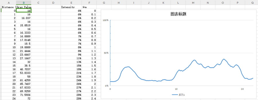 一個小提醒,如果想在Excel里做出像上面論文的圖片,可能還需要經過數據處理,前列是像素,需要根據軟件標尺換算成尺寸,通常是μm;后列是熒光強度,因為數據是8bit的,因此數值是0-255,按255為100%做個換算來畫Y軸。
