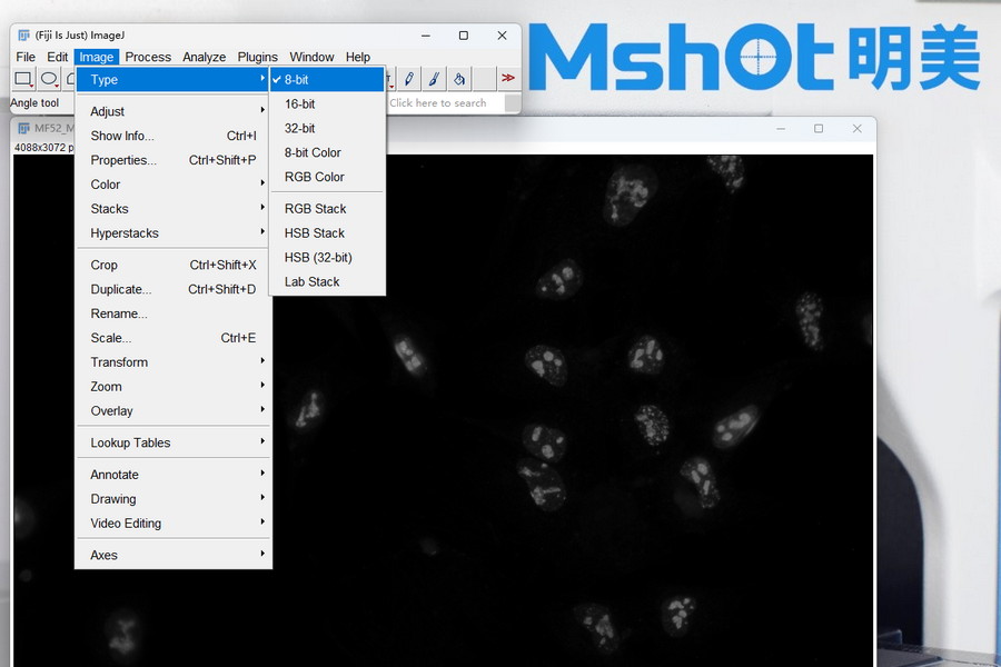 我們這個熒光圖是單色熒光,因此我們這里先將其轉化成8bit格式,減少其他通道信號可能帶來的問題,在菜單選項選擇Image-Type-8bit.