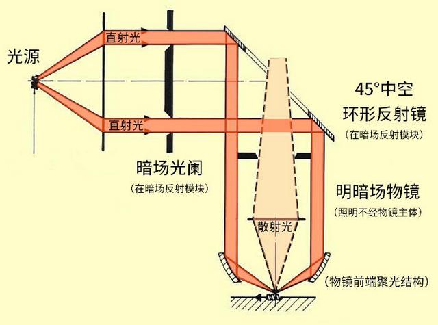 在金相顯微鏡中,明場和暗場觀察切換是通過切換反射模塊實(shí)現(xiàn)的,以金相顯微鏡MJ43為例,明場反射模塊主要是一片45°的半透半反鏡片,而暗場反射模塊則是在此基礎(chǔ)上整合了暗場光闌、45°環(huán)形反光鏡和一些減少雜散光的光闌,具體不同品牌的暗場反射模塊結(jié)構(gòu)會有不同。