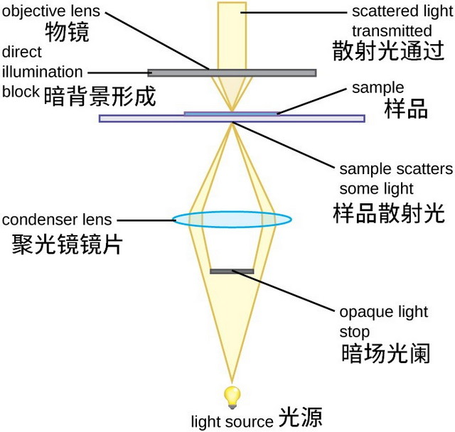 暗場成像原理簡單,擋住直射光,只讓傾斜光照明樣品,樣品產(chǎn)生散射光,然后散射光通過物鏡成像。相比透射明場光路,透射暗場只是在光源到聚光鏡鏡片之間加入了暗場光闌,來擋住光源中間的直射光,形成傾斜光照明樣品。