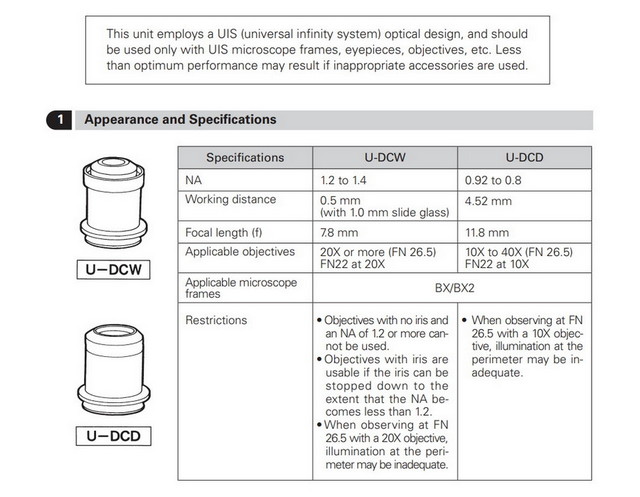 專業(yè)的暗場聚光鏡有很多種,特點(diǎn)是特殊結(jié)構(gòu),帶來特別高的N.A.以UIS系統(tǒng)的U-DCW油浸式暗場聚光鏡為例,其照明N.A可以到1.2-1.4,可以使用20X以上,N.A1.2以下的高倍物鏡。這種聚光鏡使用比較費(fèi)工夫,需要對中,并且滴油時不能有氣泡,否則暗場效果不佳。