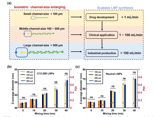 在這項研究中,研究人員提出了一種通過等比例擴大慣性微流控混合器的三維通道尺寸來實現 LNPs 可擴展合成的方法。他們設計了一種高效的慣性流混合器,并通過理論預測方法,確保在不同芯片上合成的 LNPs 具有一致的粒徑和粒徑分布。