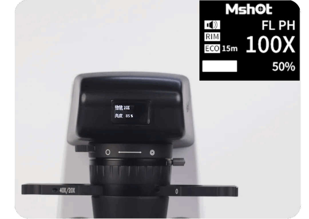直觀可量化的數顯屏幕:機身自帶OLED數顯屏幕,不僅可以顯示RIM光強管理器、ECO人走燈滅功能的狀態,還能提示物鏡種類、倍率以及量化的光強信息,方便做比對實驗和定量實驗。