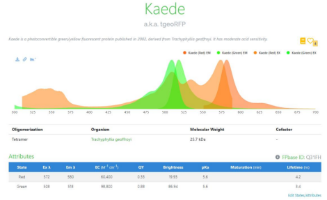 光轉化熒光蛋白Kaede有兩個激發峰,兩個發射峰