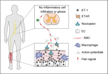 通過光遺傳學、化學遺傳學及轉基因技術,團隊發現血管內皮細胞來源的ET-1(內皮素-1)通過激活傷害性感覺神經元上的ETAR受體,形成“內皮-神經-脊髓”調控環路,驅動血管痛發生。這一發現為臨床治療提供了新靶點。