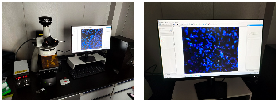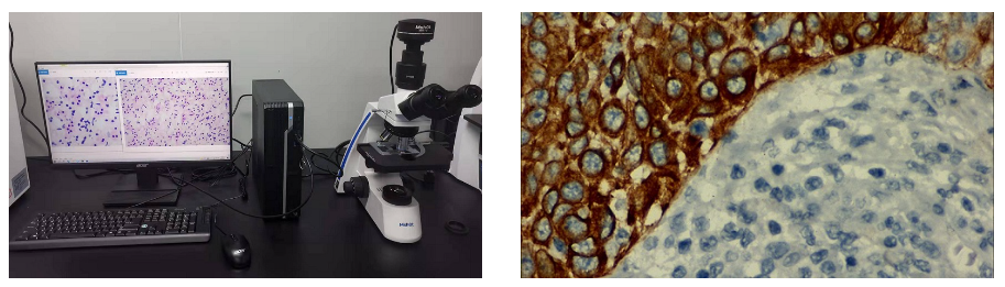 (明美生物顯微鏡搭配msx2拍攝HE染色的乳腺癌病理切片,紅色為胞質,藍色為染色體)