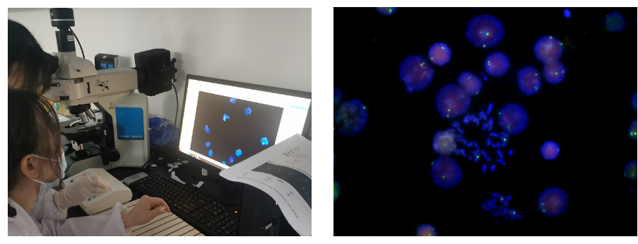 熒光原位雜交技術是一種使用熒光素標記探針,以檢測探針和分裂中期的染色體或分裂間期的染色質的雜交。其基本原理是:以核酸堿基互補配對原則為基礎所發展起來的檢測技術,主要利用DNA序列的互補性,通過熒光標記的DNA探針與預處理的待測樣本的DNA進行原位雜交,在熒光顯微鏡下, 對熒光信號進行辨別和計數,即可對細胞、組織樣本中的染色體或基因異常進行檢測和診斷。