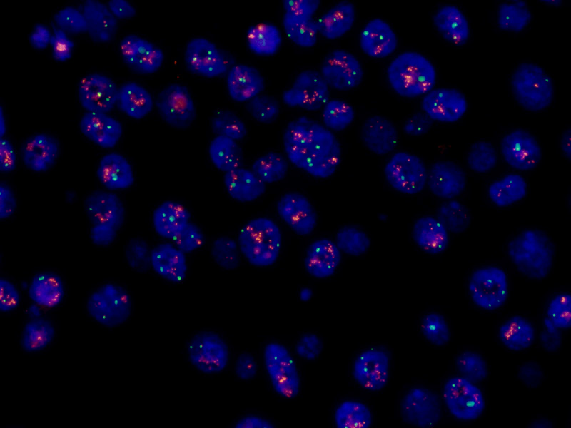 不同種類癌細胞具有特異性的基因片段,使用FISH技術進行特異性標記,通過特異性熒光信號的表達特征,來判斷是否有癌細胞或癌細胞種類。臨床應用中,在乳腺癌、宮頸癌、膀胱癌、血液腫瘤等診斷和指導用藥方面,FISH有很強的優勢。