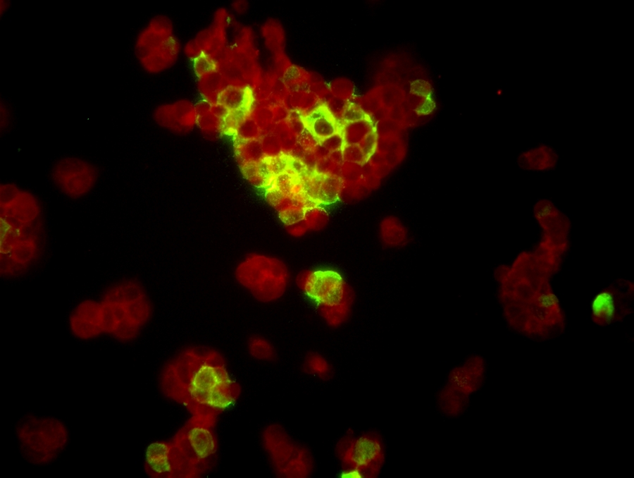 FISH做的病毒檢測,紅色為病毒外殼蛋白