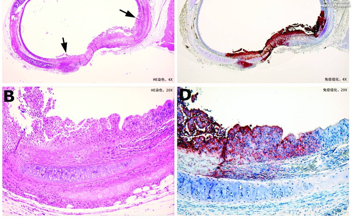 IHC免疫組化染色,猴痘病毒感染犬的支氣管(紅色為病毒反應(yīng))