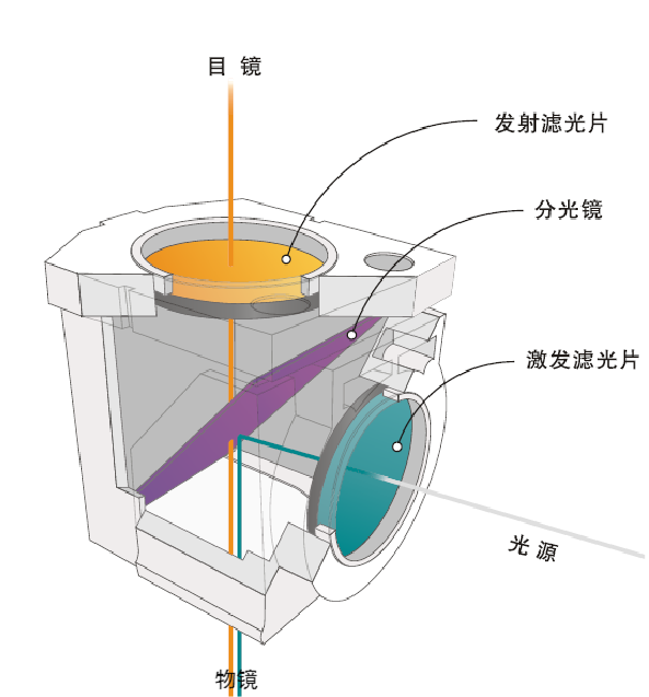 熒光激發塊由激發濾光片、二向分光鏡、發射濾光片組成。它們共同協作,確保只有特定波長的光能夠通過,從而獲得清晰的熒光圖像。