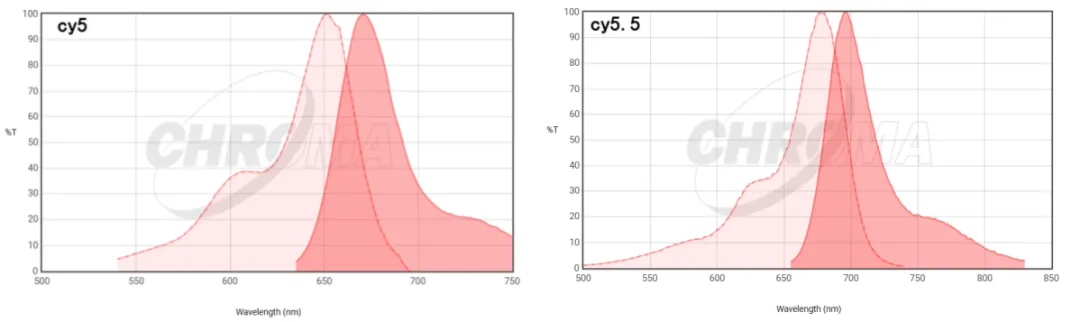CY5和CY5.5是常用的生物分子標記染料,廣泛應用于熒光顯微成像、流式細胞儀分析和小動物活體標記成像。它們的激發和發射波長位于近紅外區域,對濾光片的選擇要求極高。不恰當的濾光片選擇可能導致熒光信號弱或無法捕獲。